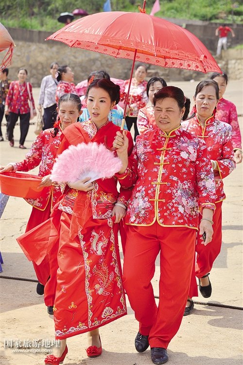 “五世其昌”的祝福對聯(lián),大紅的喜慶燈籠,插滿青草與鮮花的漁船顯得古樸而富有情調。而岸上的儀式也頗有講究:一張精心準備的圓桌,擺著一盆四季橘,一只展翅欲飛、口銜“金幣”的“鳳凰雞”,寓意飛黃騰達。一對紅燭、算盤、鏡子、糯米飯等物品,均取吉祥如意之意。迎娶新娘的時辰未到,新娘的兩位兄嫂幫她梳妝打扮,描眉盤發(fā),給發(fā)髻插上珠玉釵,換上喜氣的紅綢裙,一番梳妝打扮之后,新娘變得美艷動人。裝扮完畢,新娘邀請自家姐妹及親戚“擺歌堂”,感激父母養(yǎng)育之恩,傾訴依依惜別之情。