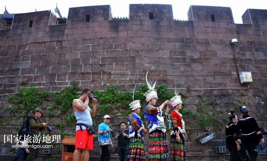 10月13日,來自湖南靖州苗族侗族自治縣的展演隊伍在鳳凰古城城樓上展示苗服。