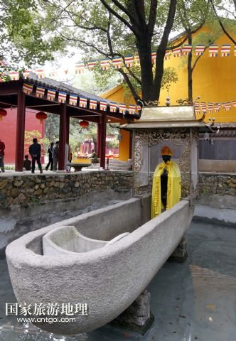 這是九江能仁禪寺內(nèi)的飛來(lái)石船。石船長(zhǎng)一丈五、寬尺余,側(cè)面有銘記,鑿于北宋慶歷六年,石船上端坐鐵佛(10月18日攝)。