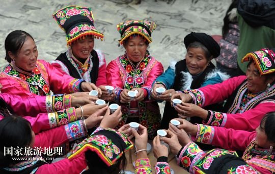 國家旅游地理 四川阿壩11月2日訊 11月2日,身著節(jié)日盛裝的四川省阿壩州汶川縣龍溪鄉(xiāng)村民們舉杯迎接羌?xì)v新年的到來。當(dāng)日,四川省阿壩州汶川縣龍溪鄉(xiāng)舉行傳統(tǒng)儀式迎接即將到來的羌?xì)v新年。今年的11月3日農(nóng)歷十月初一是羌?xì)v新年,這是羌族一年中最為隆重的“慶豐收、送祝福、祈平安”的節(jié)日,按民間習(xí)俗,過羌年時(shí)要還愿敬神,全寨人歡聚一堂,吃團(tuán)圓飯,共慶佳節(jié)。 /新華社發(fā)(何海洋 攝)