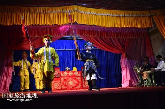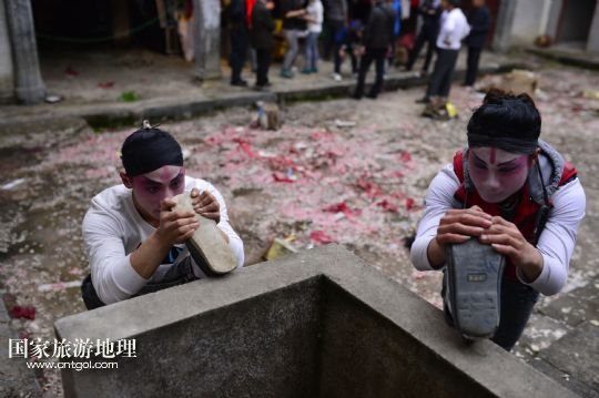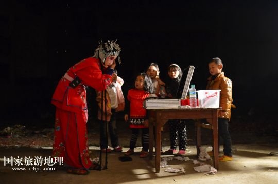 國(guó)家旅游地理 江西九江4月2日訊 在溪口鎮(zhèn)小溪村,三元班在演出寧河戲《三請(qǐng)樊梨花》(3月26日攝)。寧河戲是江西地方大型古老劇種之一,發(fā)源于江西修水縣,流行于贛北及湘、鄂、贛交界一帶。在寧河戲鼎盛的清乾隆年間,曾出現(xiàn)過“寧州十八班”,從業(yè)人員達(dá)到六七百人。然而隨著時(shí)代的變遷,寧河戲逐步?jīng)]落,最大的危機(jī)是逐漸空心化的村莊和村莊里越來(lái)越少的老戲迷。