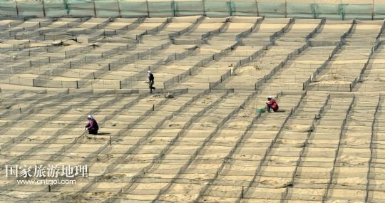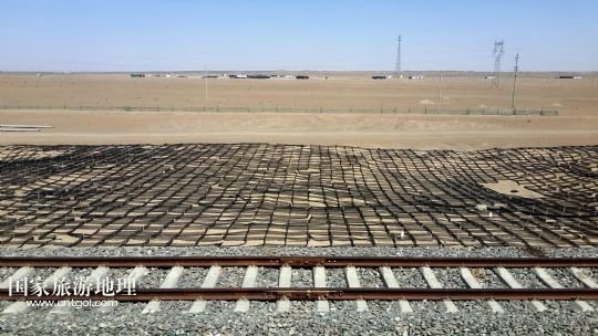 國家旅游地理 內(nèi)蒙古阿拉善4月21日訊 錯落布局在內(nèi)蒙古臨策鐵路(臨河——策克)旁的網(wǎng)格沙障(4月18日攝)。穿越我國北疆內(nèi)蒙古阿拉善高原大漠的呼和浩特鐵路局臨策鐵路沿線有400多公里“無人區(qū)”,這里常年干旱少雨、風沙肆虐、植被稀少、人跡罕至,30多萬平方公里的荒漠、戈壁縱橫交錯,自然條件極度惡劣。