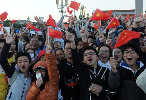 10月1日,天安門廣場(chǎng)舉行升國(guó)旗儀式。當(dāng)日清晨,來(lái)自全國(guó)各地的各族群眾在北京天安門廣場(chǎng)觀看升國(guó)旗儀式,慶祝中華人民共和國(guó)成立66周年。新華社記者 邢廣利 攝