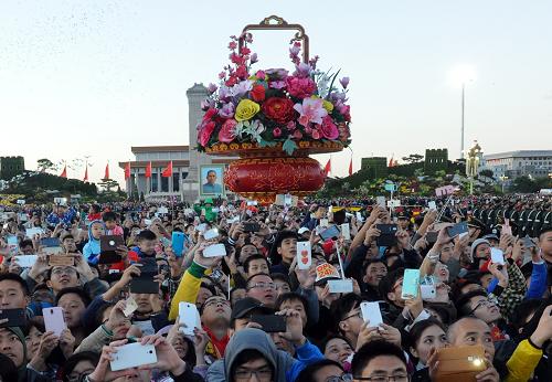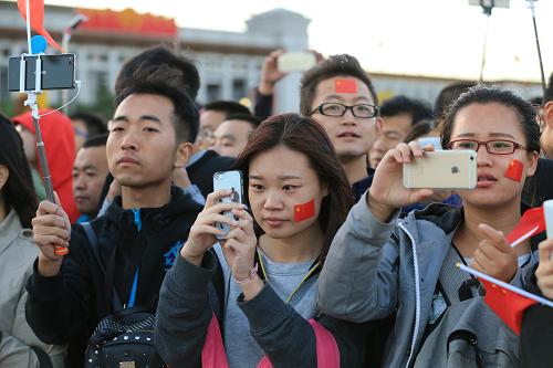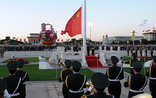 10月1日,各地群眾參加天安門廣場(chǎng)升國(guó)旗儀式。新華社記者 唐召明 攝