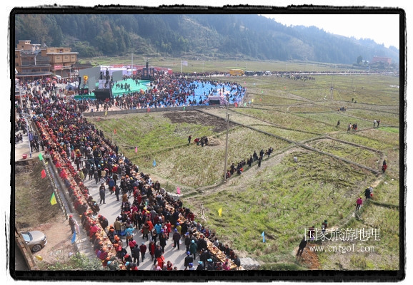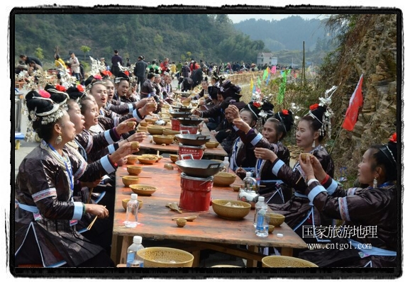 今年黎平侗年節(jié),除了延續(xù)亙古以來老百姓過侗年的各項傳統(tǒng)習(xí)俗活動外,還有“天下侗家年”大型侗族史詩情景歌舞展演、侗族萬人長桌宴、招商引資推介會、七彩田園采摘體驗、百村集市商品展銷、侗文化研討會、楊再思文化交流研討會等多項主題活動,其中,主打主推的“最大合攏宴”(萬人長桌宴)品牌,得到基尼斯紀錄總部到現(xiàn)場認定,以1700桌合攏宴,總長3.7公里,10380人同桌就餐,創(chuàng)歷史之最,成功載入《基尼斯紀錄大全》,吸引數(shù)萬旅游客到場親自見證、參與、感受和體驗這一千載難逢,氣勢恢宏的盛況。