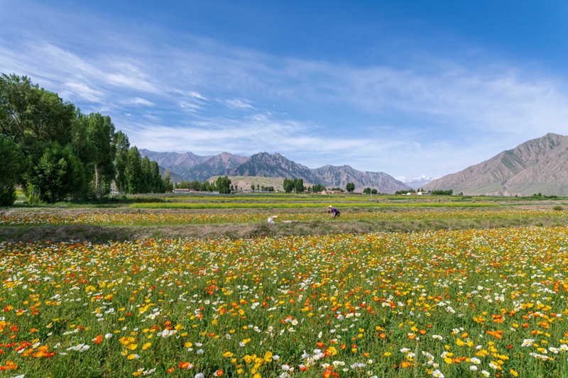 時(shí)值盛夏,地處祁連山北麓高海拔山區(qū)的甘肅省高臺(tái)縣新壩鎮(zhèn)紅沙河村種植的虞美人繽紛綻放,形成花海景觀。近年來,高臺(tái)縣新壩鎮(zhèn)將花卉蔬菜制種作為特色產(chǎn)業(yè)來抓,積極引導(dǎo)農(nóng)戶規(guī)?;⒓谢N植,成為當(dāng)?shù)剞r(nóng)業(yè)增效、農(nóng)民增收的支柱產(chǎn)業(yè)之一。